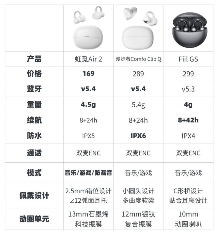 虹觅Air2:为了开放式耳机的漏音痛点,这款耳机搭载了虹觅自研的防漏音模式,能减少泄露的声音。蓝牙是最新的5.4版本,连接搭配了HBC智慧双联,可拆成两幅耳机使用。具备IPX5 防水,日常汗水、雨水都不怕。续航长达8+24h。60ms超低声音延时,游戏音画几乎同步。